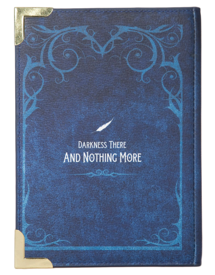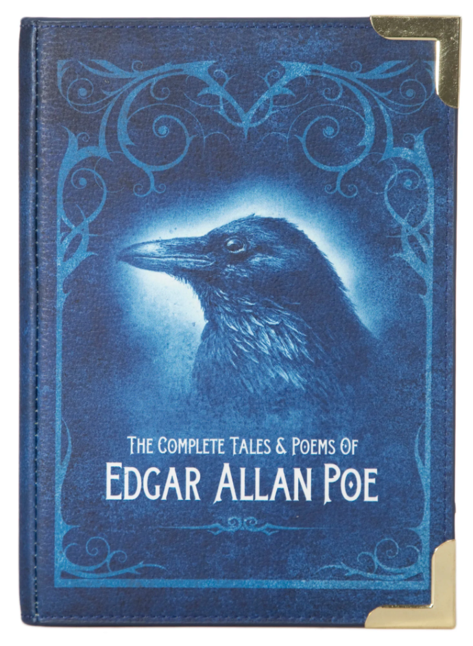 Vier de duistere schoonheid van Edgar Allan Poe. Breng een eerbetoon aan een van de grootmeesters van de Amerikaanse literatuur met deze prachtige handtas, geïnspireerd op The Complete Tales and Poems of Edgar Allan Poe. De tas is uitgevoerd in elegant donkerblauw vegan leer, versierd met een mysterieus ontwerp waarin de beroemde raaf centraal staat. Op de achterzijde prijkt de onheilspellende quote: “Darkness there and nothing more.”