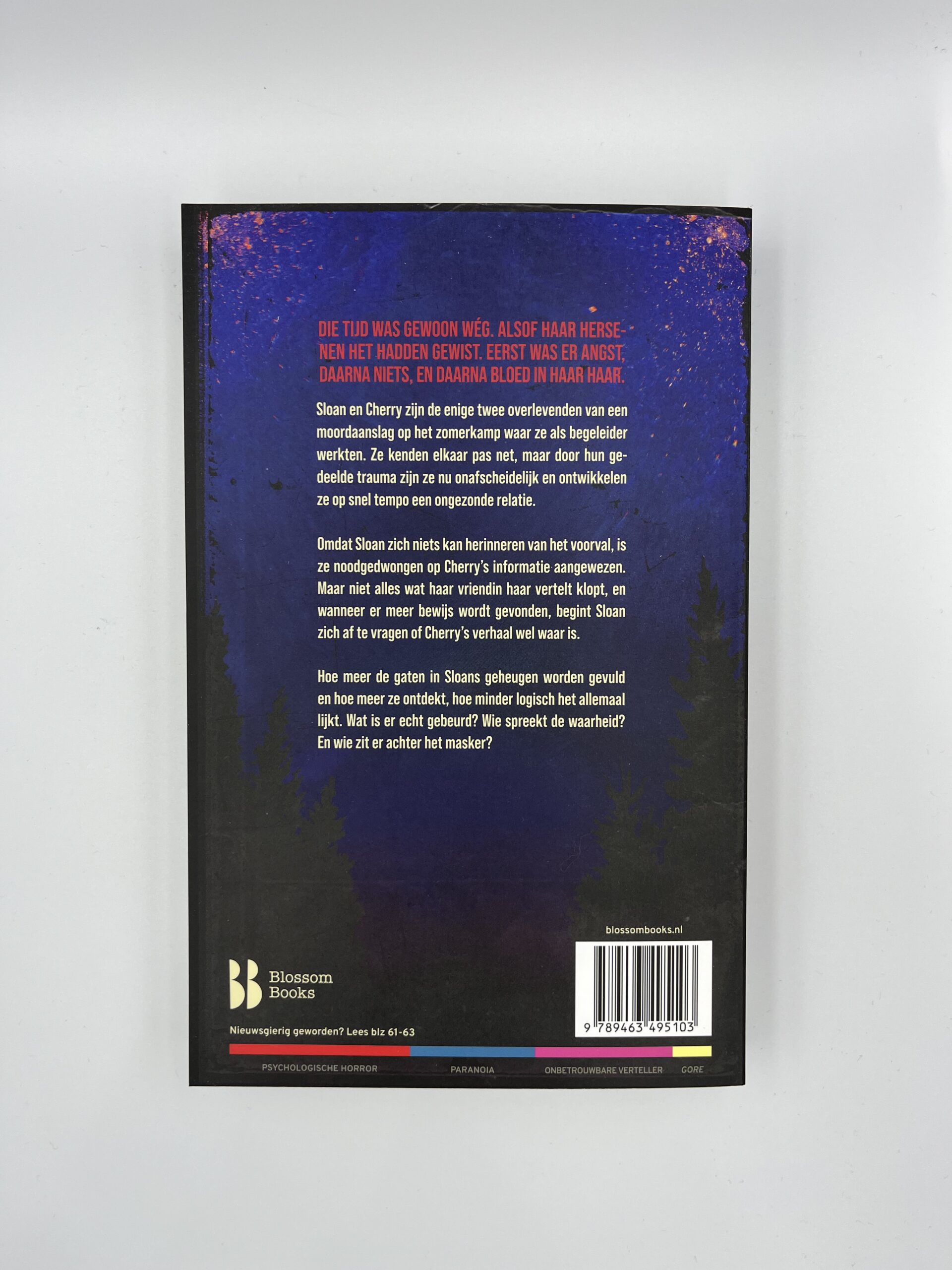 Twee kampbegeleiders overleven een bloedbad, maar als herinneringen terugkeren, blijkt dat niets is wat het lijkt. Een YA-thriller over trauma, obsessie en de angstaanjagende kracht van vergeten.