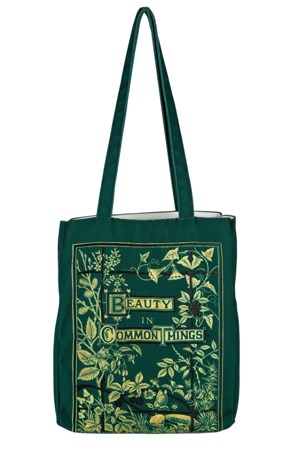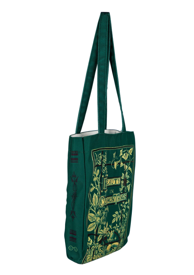Deze tas is perfect om alle dagelijkse benodigdheden te dragen, van boodschappen tot studieboeken, deze draagtas zorgt ervoor dat je opvalt! De handige draagtas is geïnspireerd op het boek ‘Beauty in Common Things’ van Miss A. C. Chambers, gepubliceerd in 1874. Het heeft een prachtige botanische illustratie tegen een diepgroene achtergrond, die de essentie vastlegt van de diepe waardering van het boek voor alledaagse planten en bloemen die in het Verenigd Koninkrijk te vinden zijn. Gemaakt van 100% polyester. Het ontwerp is duurzaam en handig met een extra binnenzak voor kleine spullen. De achterkant van deze tote bag is versierd met een vlinder.