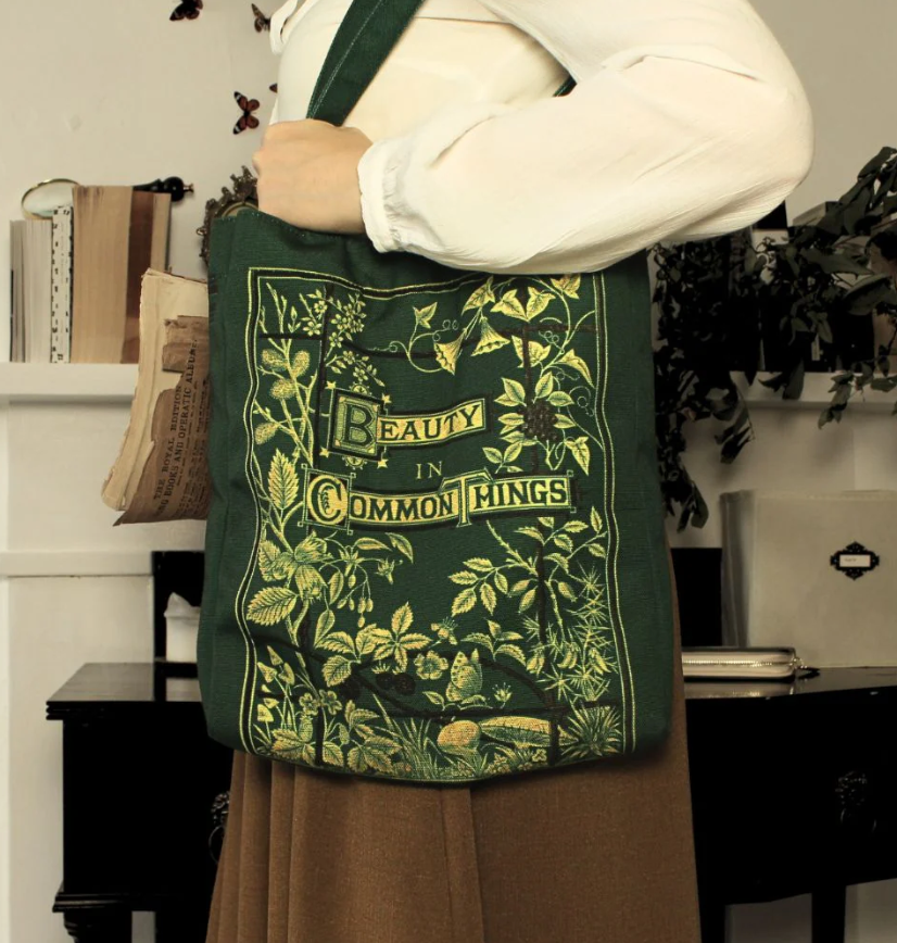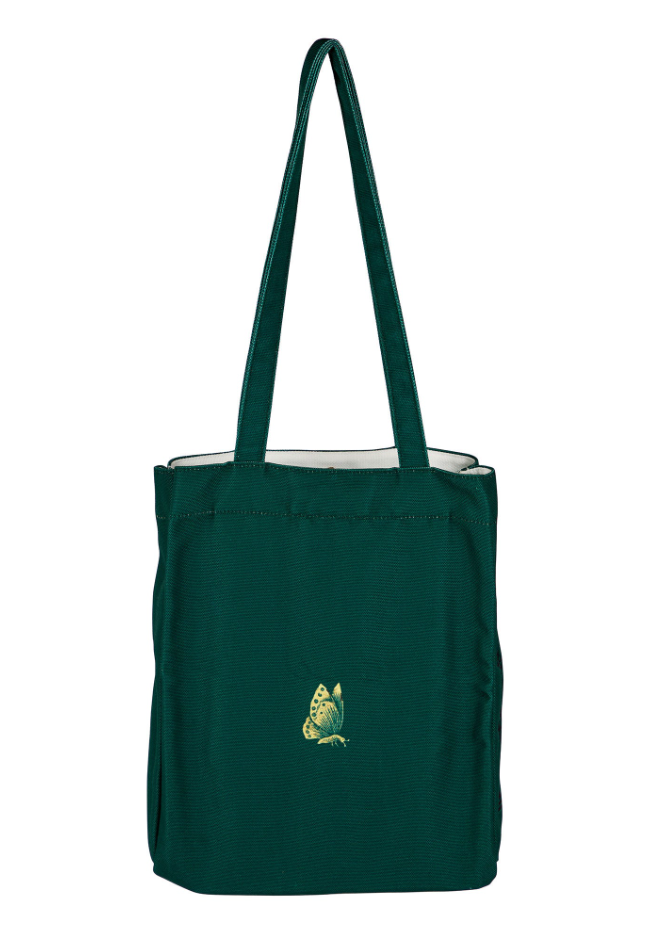 Een unieke groene tote bag geïnspireerd op Beauty in Common Things van Miss A. C. Chambers, met een ontwerp met planten en bloemen en op de achterkant een gedetailleerde vlinder.
