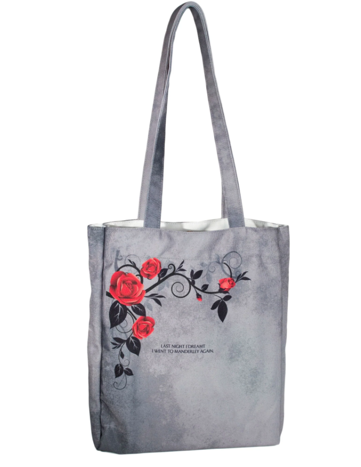 Een prachtige grijze tote bag geïnspireerd op de gotische roman van Daphne du Maurier, Rebecca, met de quote ‘last night I dreamt I went to Manderley again’.