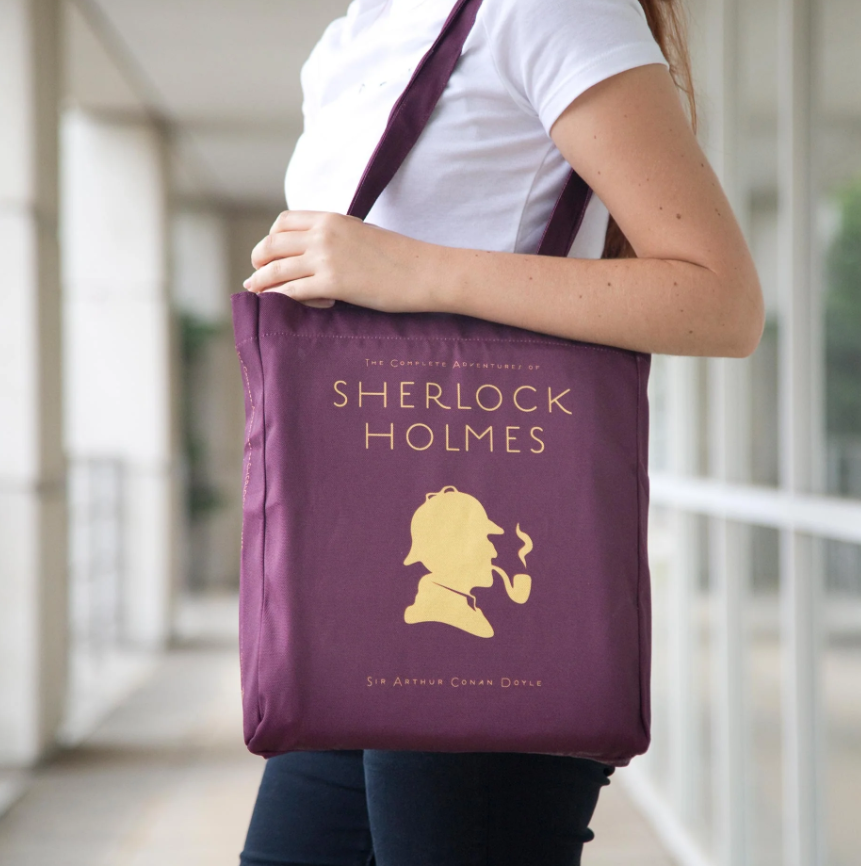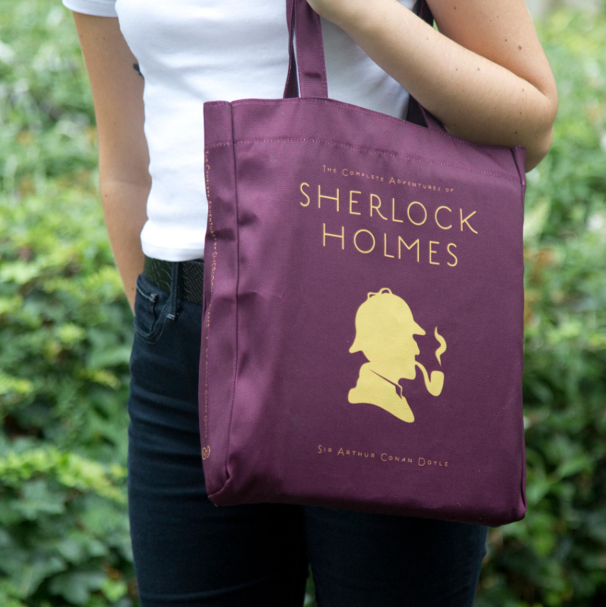 Word verliefd op deze handige en duurzame draagtas, ter ere van Sherlock Holmes van Arthur Conan Doyle. Het heeft een mooie bordeauxrode achtergrond achter het iconische silhouet van Sherlock Holmes, compleet met deerstalker cap en pijp. Op de achterkant van de tas staan de twaalf titels van de korte verhalen van Sherlock Holmes.