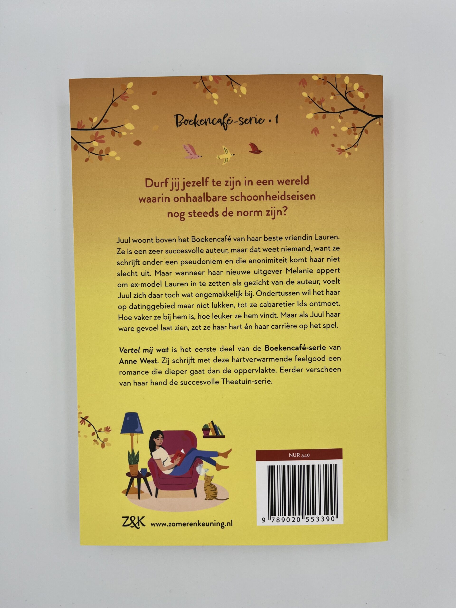 Vertel mij wat is het eerste deel van de Boekencafé-serie van Anne West. Zij schrijft met deze hartverwarmende feelgood een romance die dieper gaat dan de oppervlakte. Eerder verscheen van haar hand de succesvolle Theetuin-serie.