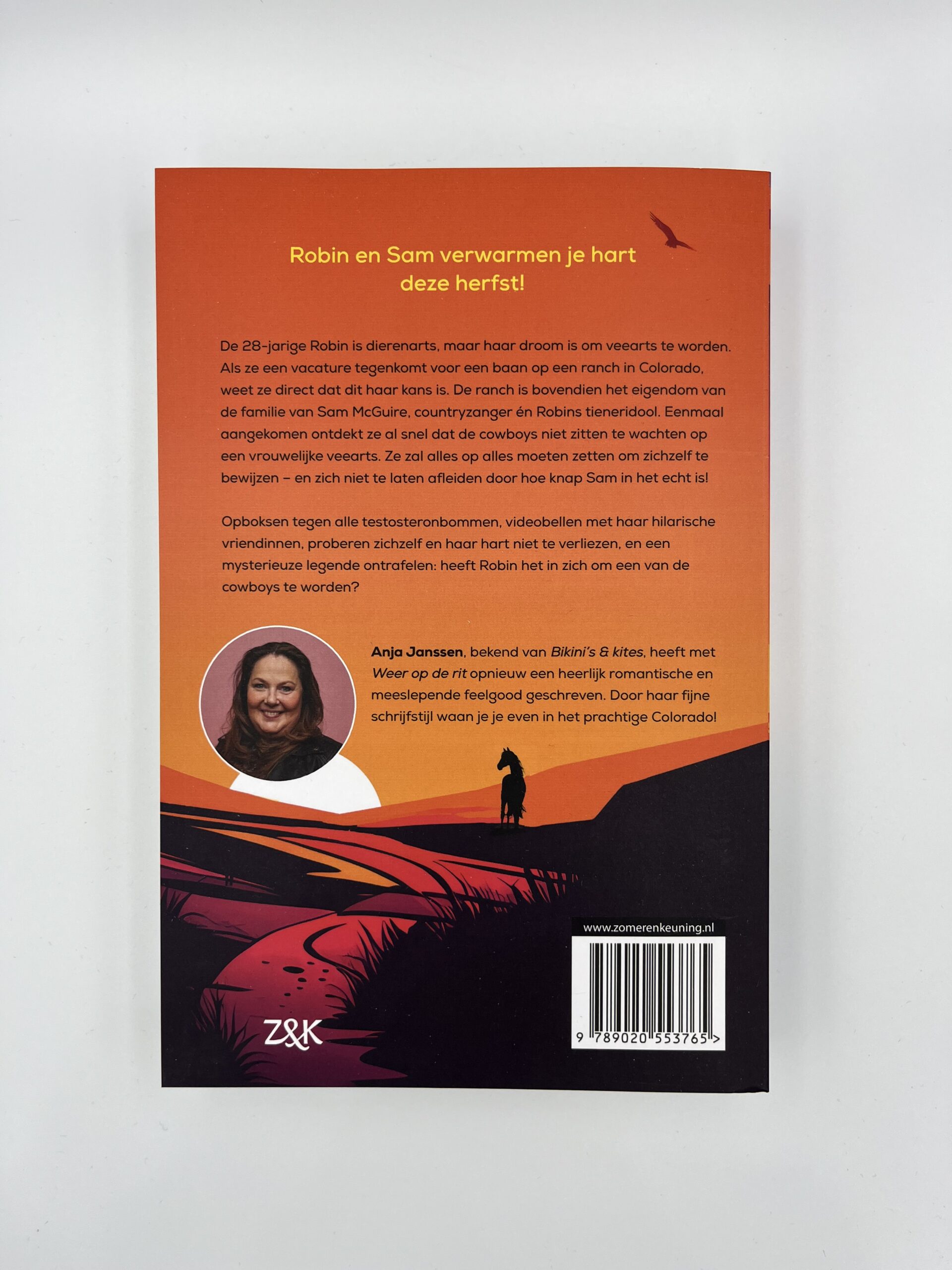 Als Robin aan de slag gaat op de ranch van haar favoriete countryzanger, komt haar droom uit. Maar zit hij wel op haar te wachten? Weer op de rit is een heerlijke herfstromance op een cowboyranch in Colorado. De 28-jarige Robin is dierenarts in Nederland, maar stiekem droomt ze ervan om als veearts aan de slag te gaan. Dus als er een vacature online komt voor een ranch in Colorado, grijpt ze haar kans. Wat het nóg leuker maakt, is dat de ranch eigendom is van de familie van Sam McGuire, countryzanger én Robins tieneridool. Maar als ze eenmaal geland is, slaat haar droom om in een herfststorm. De cowboys zitten helemaal niet te wachten op een vrouwelijke veearts. Zal Robin erin slagen hun vertrouwen te winnen?