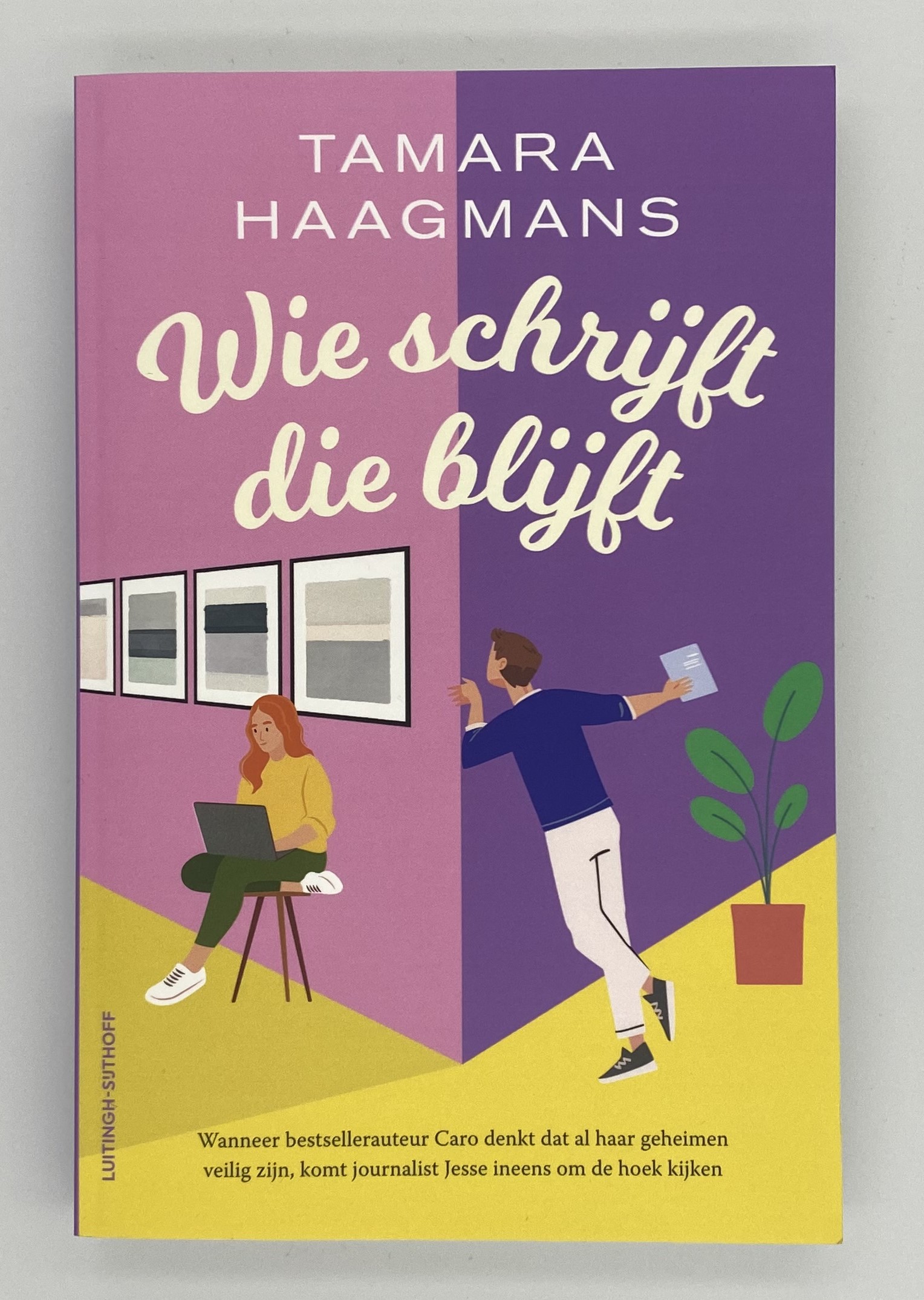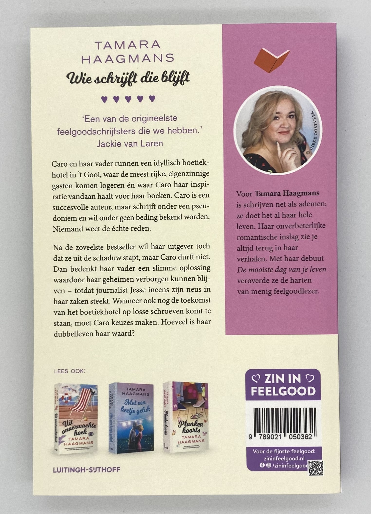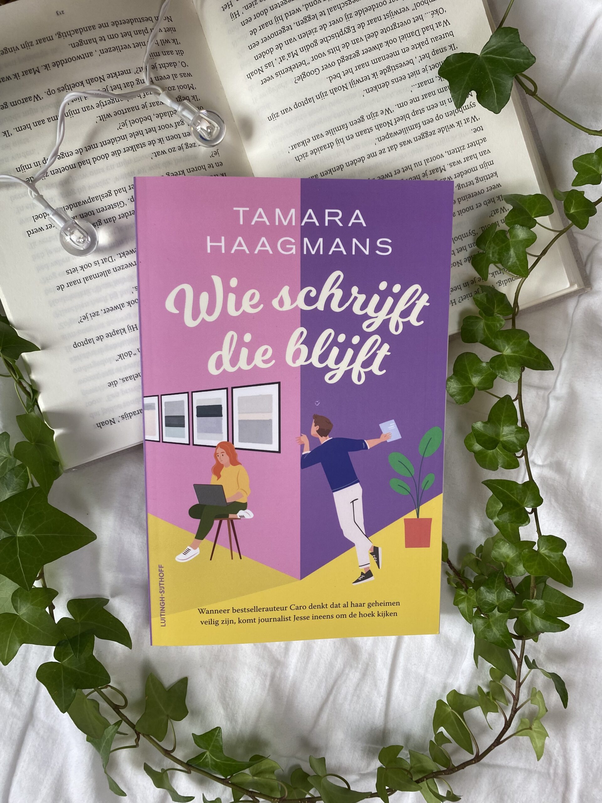 In deze sprankelende feelgoodroman Wie schrijft die blijft van Tamara Haagmans volgen we Caro, een succesvolle schrijfster met een geheim dubbelleven, die samen met haar vader een idyllisch boetiekhotel in ’t Gooi runt, waar de meest rijke, eigenzinnige gasten komen logeren én waar Caro haar inspiratie vandaan haalt voor haar boeken. Caro is een succesvolle auteur, maar schrijft onder een pseudoniem en wil onder geen beding bekend worden. Niemand weet de échte reden.