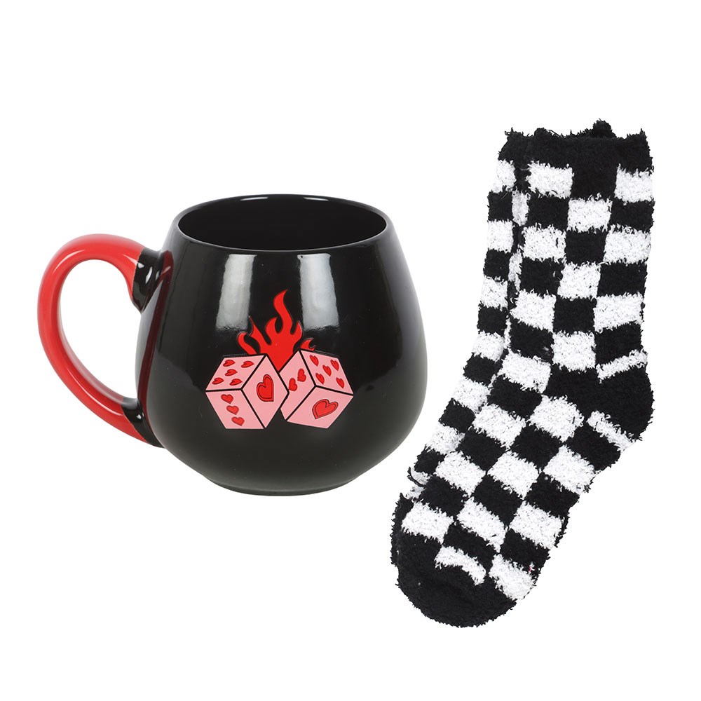 Knusse cadeauset met een mok in de vorm van een brandende dobbelsteen en superzachte sokken met een dambordpatroon.